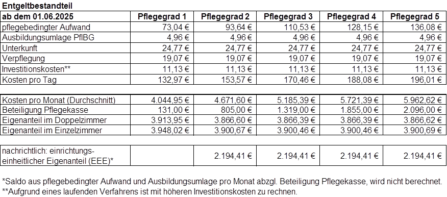 Alle oben genannten Pflegesätze werden regelmäßig neu mit dem Landschaftsverband Westfalen-Lippe und der Arbeitsgemeinschaft der Pflegekassen in NRW vereinbart. Daher können wir für die Aktualität der jeweils genannten Beträge keine Gewähr geben. Druckfehler und Irrtümer sind vorbehalten.
